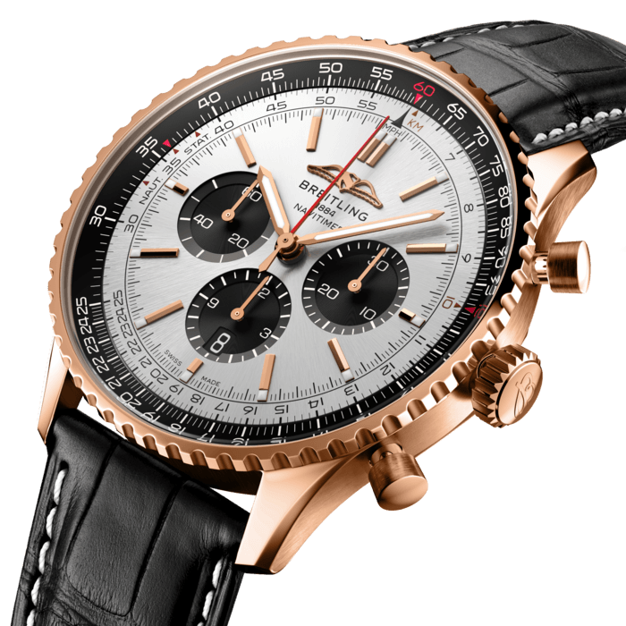 Der legendäre Fliegerchronograph von Breitling – für die Reise. Im Jahr 1952 entwickelt Willy Breitling einen Chronographen mit einem kreisförmigen Rechenschieber, mit dem Piloten alle notwendigen Flugberechnungen durchführen können. Zwei Jahre später macht die renommierte amerikanische Vereinigung AOPA (Aircraft Owners and Pilots Association) diese Ausführung zu ihrem offiziellen Zeitmesser. Die «Navigation Timer» – oder Navitimer – ist geboren. Die AOPA ist und bleibt der grösste Pilotenverein der Welt und zählt fast jeden US-Piloten zu ihren Mitgliedern. Als De-facto-Fliegeruhr während der glorreichen Ära der zivilen Luftfahrt wurde die Navitimer von Piloten und Flugbegeisterten gleichermassen getragen. 1962 schaffte sie es am Handgelenk des Astronauten Scott Carpenter sogar ins Weltall. Doch nicht nur Piloten waren von der unbändigen Ästhetik der Uhr beeindruckt. Berühmtheiten wie Miles Davis oder Serge Gainsbourg gehörten ebenfalls zu ihren Fans und bewiesen damit, dass die Navitimer nicht nur stilvoll, sondern auch funktional war. Seit ihrer Markteinfürung vor 70 Jahren wurden diverse Modelle dieser Breitling Ikone lanciert, doch diese neue Navitimer überzeugt mit ihren klassischen Eigenschaften, die mithilfe moderner Verbesserungen noch verfeinert wurden. Ein abgeflachter Rechenschieber und ein gewölbtes Glas schaffen den Eindruck eines schlankeren Profils. Der Wechsel von polierten und gebürsteten Metallelementen sorgt für ein schimmerndes und dennoch dezentes Aussehen. Es sind vor allem die neuen Farben in Blau-, Grün- und Kupfertönen, die die aktualisierten Zifferblattoptionen definieren. Und wenn es eine Neuerung gibt, die für Nostalgie sorgen wird, sind es die AOPA-Flügel, die nun wieder dort sind, wo sie ursprünglich waren – bei 12 Uhr. Seit bereits 70 Jahren erfreut sich die Original-Fliegeruhr grosser Beliebtheit bei Piloten und Trendsettern gleichermassen. Getragen von Astronauten im Weltraum und von den grössten Stars der Welt, handelt es sich um den legendärsten Zeitmesser von Breitling und um eine der unverwechselbarsten Uhren aller Zeiten.