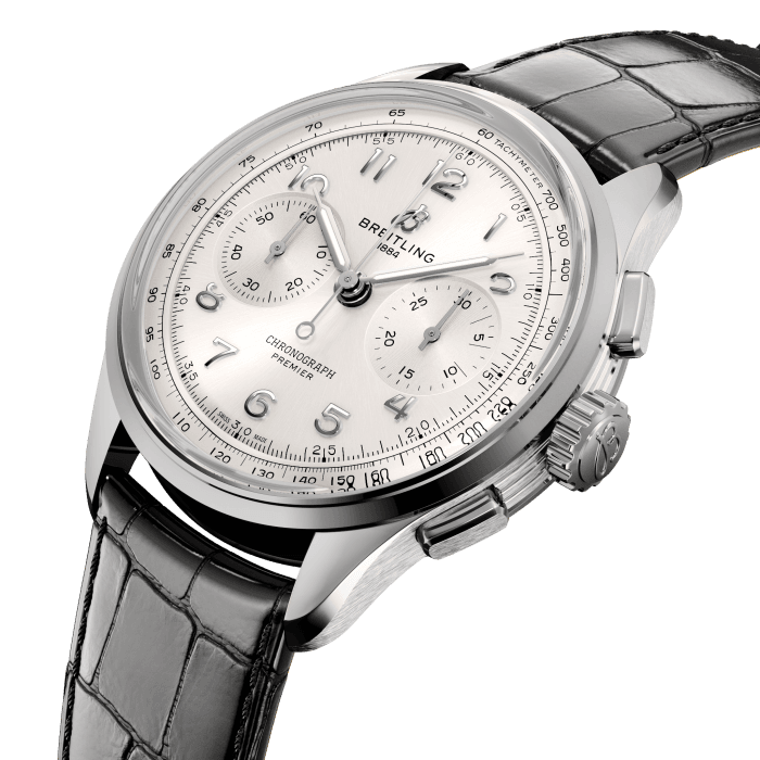 Die Breitling Premier Kollektion ist eine Hommage an drei Generationen von Innovatoren – Léon, Gaston und Willy Breitling – und verkörpert damit das Erbe des Unternehmens als Erfinder des modernen Chronographen. Nach Willy Breitlings Auffassung gibt die Premier «unweigerlich Zeugnis von tadellosem Geschmack». Die aktuelle Premier Kollektion haucht diesem Vermächtnis neues Leben ein und demonstriert gleichzeitig das ganze Können der Uhrmacher von Breitling. Sie wartet mit einer Reihe von Komplikationen auf: dem Chronograph, dem Duograph mit Schleppzeiger, der Datora mit umfassender Kalenderfunktion und dem Tourbillon. In der modernen Interpretation seines klassischen Designs besticht der Premier Chronograph durch zahlreiche elegante Details wie Nuten an den Gehäuseseiten, rechteckige Chronographendrücker, arabische Ziffern und Zeiger im Vintage-Stil. Ergänzt werden diese Highlights durch einen Gehäuseboden aus Saphirglas, der das COSC-zertifizierte Breitling-Manufakturkaliber B09 mit Handaufzug aufs Schönste zur Geltung bringt.