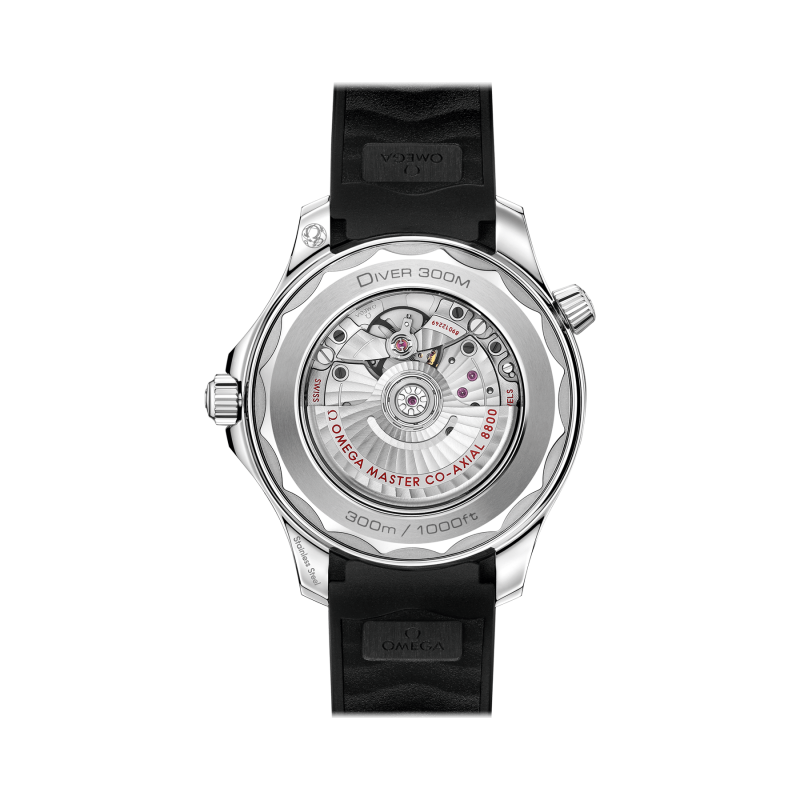 Angetrieben wird die Uhr mit integriertem schwarzem Kautschukarmband vom OMEGA Master Chronometer Kaliber 8800, das durch das Saphirglas des Gehäusebodens mit gewelltem Rand bewundert werden kann.