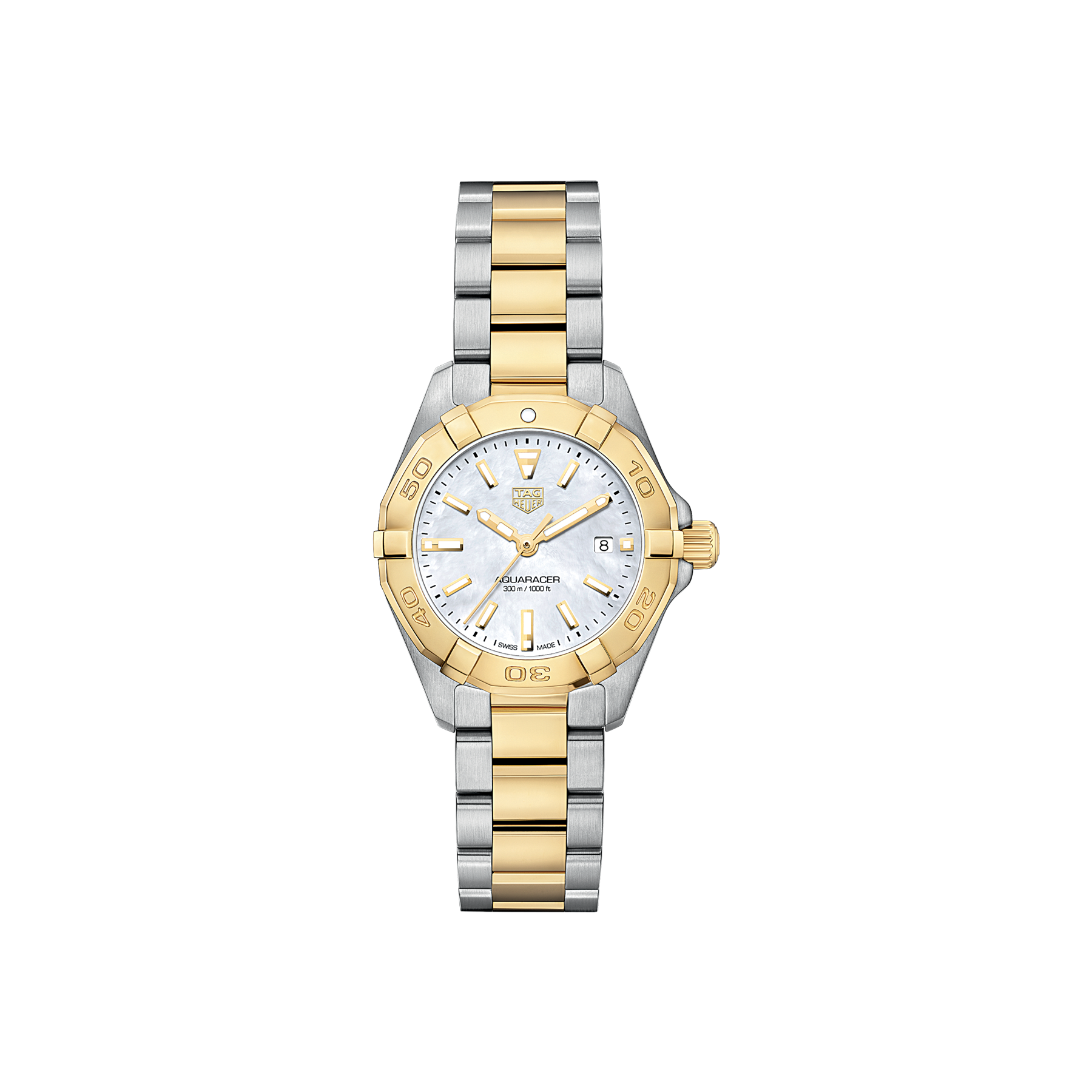 Ziehen Sie alle Blicke auf sich, mit dieser faszinierenden Kombination aus Edelstahl und Gold. Die Uhr mit einem diskreten Durchmesser von 27 mm ist mit einer 18K goldbeschichteten, einseitig drehbaren Lünette und einer verschraubten Krone bei 3 Uhr ausgestattet. Das Zifferblatt besteht aus weißem Perlmutt.