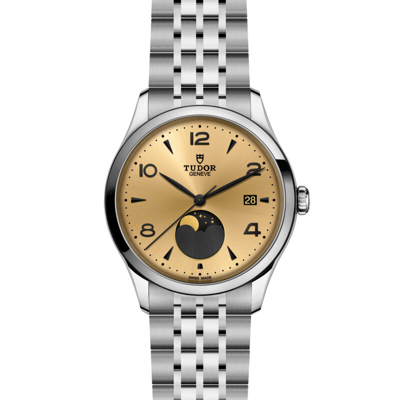 | Ziffernblatt | Champagnerfarbenes Zifferblatt mit satinierter Oberfläche im Sonnenschliff, applizierten Ziffern und Mondphasenanzeige |